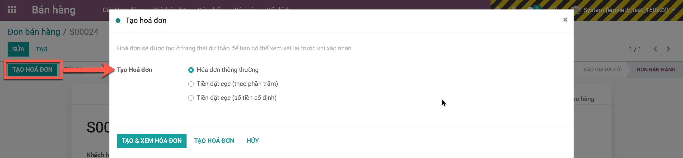+ Người dùng kích nút Tạo hóa đơn >> chọn hình thức lên hóa đơn để tạo hóa đơn công nợ cho đơn hàng ở trạng thái Nháp.