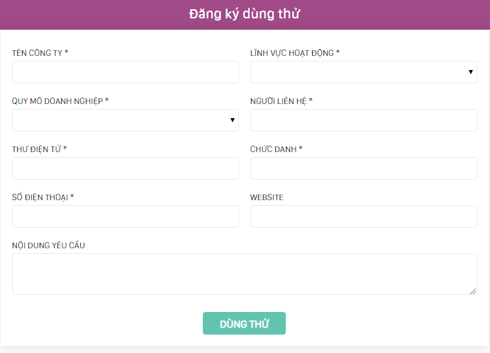 Điền đầy đủ các trường bắt buộc được đánh dấu (*) và ấn vàn nút DÙNG THỬ. Sau đó, hệ thống sẽ khởi tạo và gửi về địa chỉ email của bạn thông tin để đăng nhập cũng như tài liệu hướng dẫn sử dụng hệ thống phần mềm quản lý spa dùng thử của doanh nghiệp.